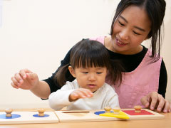 | ・1歳8ヶ月の子ども | 紐を使用して車や動物をくっつけるおもちゃがあり、まだ一人で紐を通すことは出来ないが、穴から少し紐を出すと自分で引っぱることが出来、何度も繰り返す姿が見られた。普段笑顔の多い子どもだが、じっとだまったまま真剣に紐を通しており、熱中している表情が見られ、紐が通ると満足し、満ち足りた表情をしていた。 |